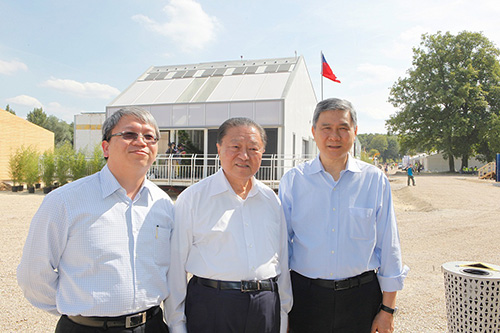 台達創辦人暨榮譽董事長鄭崇華(中)、董事長海英俊(右)與歐洲區總經理張財星(左)於台達協助交大打造的蘭花屋前留影