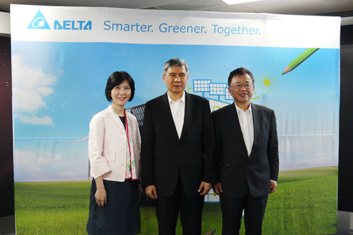 台達董事長海英俊先生(中) 、日本分公司總經理柯進興先生(右)、品牌長郭珊珊女士出席7月22日展前記者會,宣布台達參展Techno–Frontier 2014,首度在日本以完整自有品牌展出全方位發電、儲能及節能解決方案。