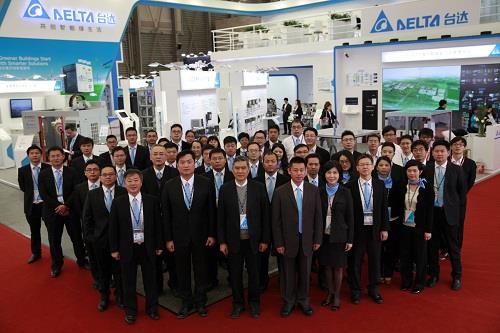 台達董事長海英俊(前排左三)、執行長鄭平(左四)、品牌長郭珊珊(左五)、發言人周志宏(左一)、中達電通董事總經理游文人(左二)攜台達團隊出席2014年中國國際工業博覽會。