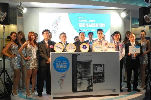 展會開幕日上午,台達代表CNC系統產品經理蘇祥瑞先生(前排右3)與經濟部工業局呂正華副局長(前排右4)、PMC財團法人精密機械研究發展中心嚴瑞雄董事長(前排左3),和另外兩大控制器廠商代表,一同為國產應用館進行啓動儀式,揭開活動續幕