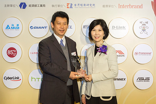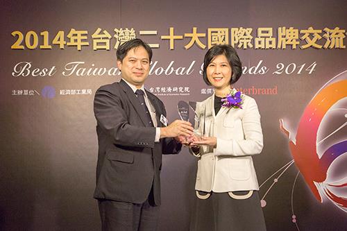 經濟部工業局局長吳明機先生(左)頒發台灣20大國際品牌獎盃,台達品牌長郭珊珊女士代表受獎 (右)
