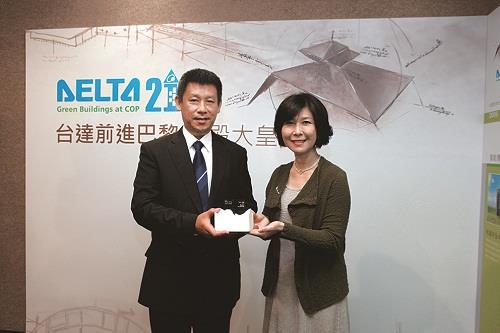 台達電子執行長鄭平 (左) 與品牌長暨文教基金會執行長郭珊珊預告台達在COP21大會期間將以十年籌建21棟綠建築為題,在法國大皇宮推出綠建築展。