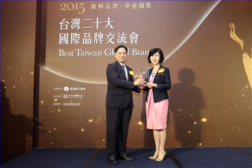 經濟部工業局局長吳明機先生(左)頒發台灣20大國際品牌獎盃,台達品牌長郭珊珊女士代表受獎 (右)