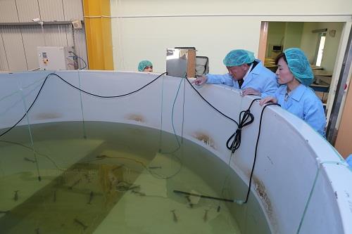 成功大學蘇校長(右)向台達鄭創辦人解說養殖實驗室的設備與實驗過程。
