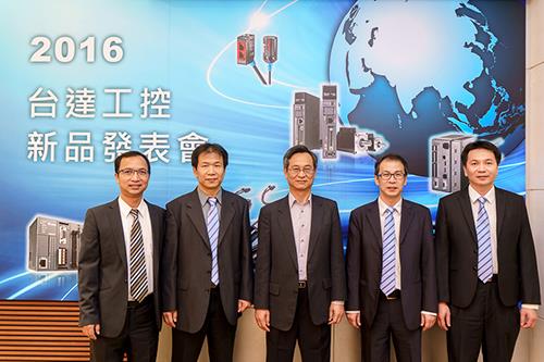 資深副總裁暨機電事業群總經理張訓海(中)與機電事業群主管共同發表2016年工控新品。左起:運動控制事業總經理蔡清雄先生(左一)、PLC事業部總經理翟立文先生(左二)、智慧感測器產品處資深處長張紹雄先生(右二)、驅動產品事業部總經理張瑞全先生(右一)