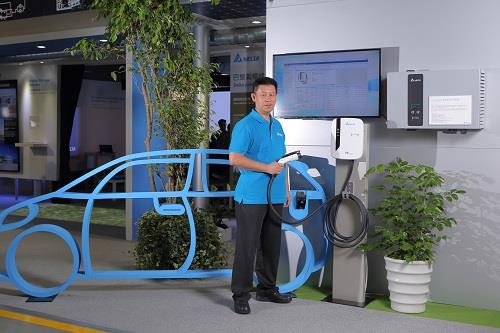 台達執行長鄭平於台達的「智慧綠建築」展區示範電動車充電的智慧應用。