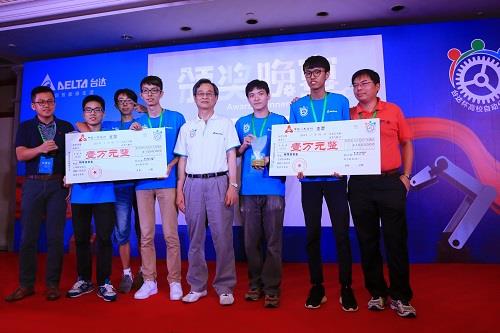 台達資深副總裁暨機電事業群總經理張訓海為臺北科技大學「有牌有保庇隊」和廈門大學「雲圖隊」頒發「智造高手」特等獎。