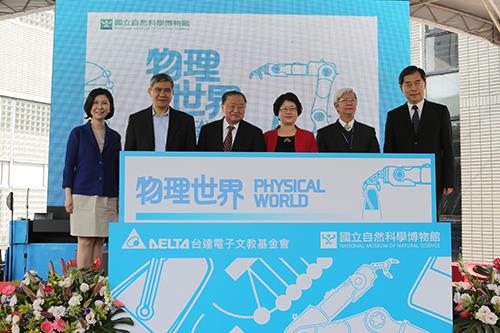 照片1:台達電子文教基金會執行長郭珊珊、台達電子董事長海英俊、台達集團創辦人暨台達電子文教基金會董事長鄭崇華、教育部終身教育司司長黃月麗、台中市教育局督學朱國隆、國立自然科學博物館館長孫維新共同為「物理世界」揭開序幕