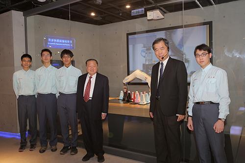 照片2:台達創辦人鄭崇華與其母校台中一中的學弟及國立自然科學博物館館長孫維新一同觀賞台達機械手臂展示的同步共振現象