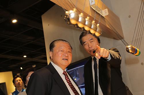 照片3:國立自然科學博物館館長孫維新向台達集團創辦人鄭崇華解說牛頓擺的原理。