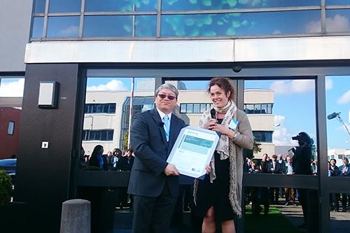 荷蘭綠建築委員會總經理Annemarie van Doorn (右)將BREEAM綠建築認證頒發給EMEA區總經理張財星