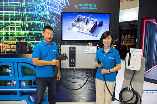COMPUTEX 2017 台達展現軟硬體整合實力, 台達執行長鄭平先生(左)與品牌長郭珊珊女士為媒體展示台達電動車充電解決方案