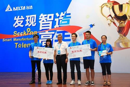 台達董事長海英俊(左三)為榮獲特等獎的臺灣中原大學「天下萬物不求人」團隊以及合肥工業大學「斛兵」團隊頒獎。