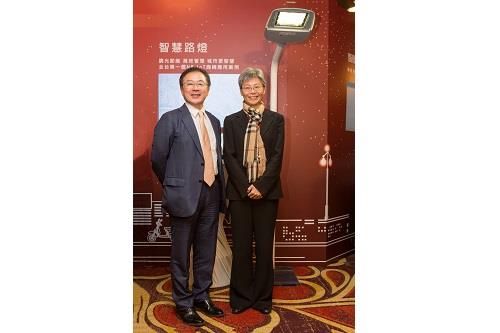台達發言人暨企業信息部資深協理周志宏(左)出席遠傳電信「物聯網生態圈啟動 暨 NB-IoT服務上市記者會」,與遠傳電信總經理李彬在台達智控路燈展區合影。