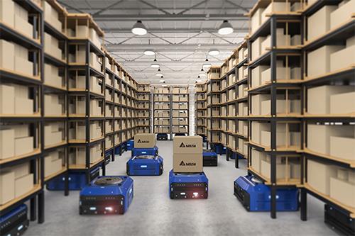 無人搬運車 (AGV) 採用台達高階泛用型控制器AS300系列,可控制交流伺服器驅動AGV的運動元件,同時並監控電池狀況與四周安全