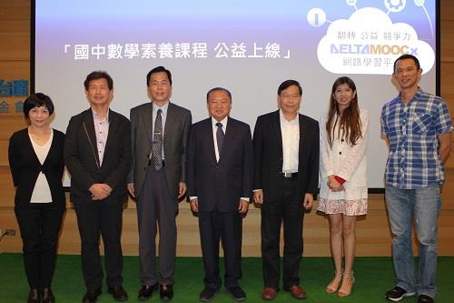 台達創辦人暨台達基金會董事長鄭崇華先生(中)、國家教育研究院副院長郭工賓先生(左三)、DeltaMOOCx計畫主持人彭宗平教授(右三)、建國中學曾政清老師(左二),共同出席DeltaMOOCx線上學習平台國中數學素養課程公益上線記者會