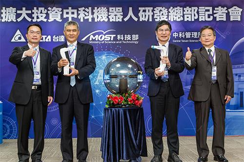 台達擴大投資中科機器人研發總部,台達董事長海英俊(左二)與科技部長陳良基(右二)在聯合記者會中手持縮小版台達工業機器人模型合影,台達機電事業群總經理劉佳容(左一)及中科管理局局長陳銘煌(右一)亦共襄盛舉。