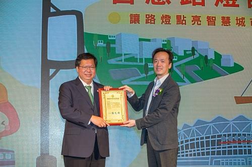 台達LED智慧路燈解決方案協助桃園打造智慧城市,並節省可觀電費。台達照明事業部處長林昆閱(右)於「桃園市智慧路燈論壇」代表台達接受桃園市長鄭文燦頒贈感謝狀。