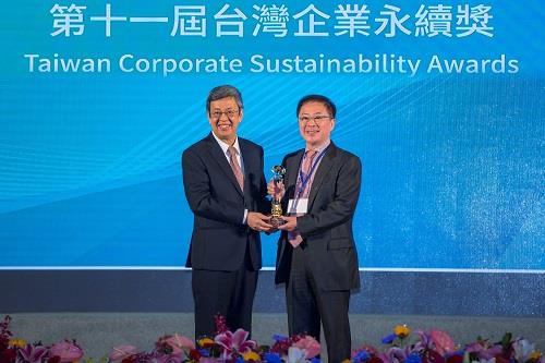 台達發言人暨企業永續發展部資深協理周志宏(右)獲副總統陳建仁頒贈十大永續典範台灣企業獎座。