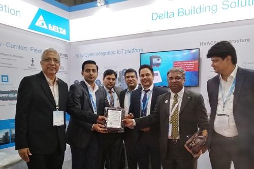 台達印度分公司樓宇自動化解決方案事業處業務總監Vaibhav Bagu (左二)帶領團隊向印度暖通空調工程師協會(ISHRAE)成員介紹台達智慧樓宇解決方案。