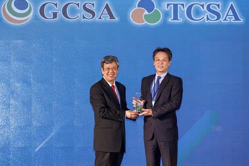 台達人資長陳啟禎(右)代表台達獲副總統陳建仁頒贈十大永續典範台灣企業獎座。