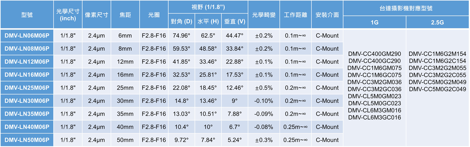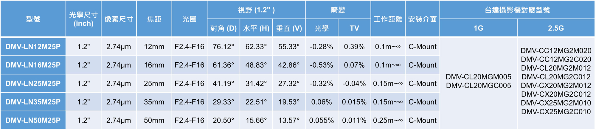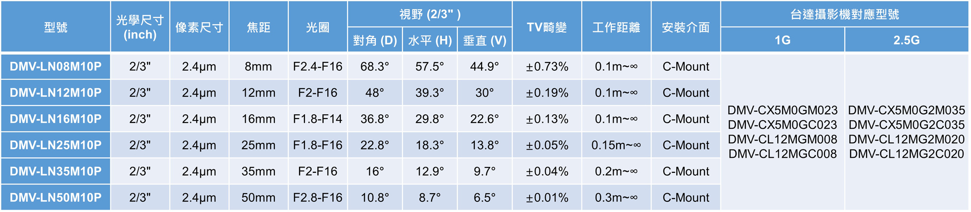 台達 DMV-LN 系列工業鏡頭,專為工業自動化檢測與成像設計。提供 6mm 至 50mm 完整焦段,涵蓋 6MP、10MP 與 25MP 三種像素選擇,支援 1/1.8”、2/3” 和 1.2”光學尺寸,靈活應對多種機器視覺與檢測應用需求。