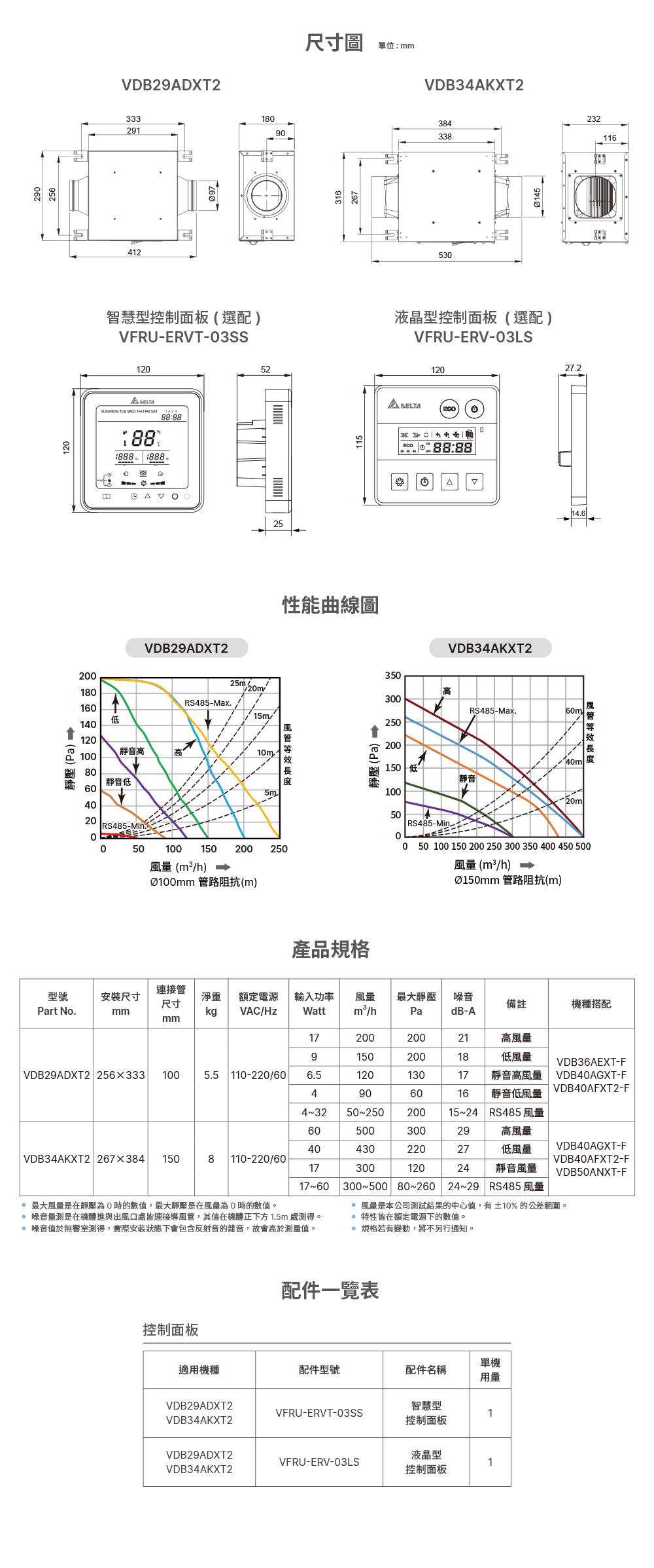 台達負壓排氣型管道扇系列VDB29ADXT2、VDB34AKXT2,快速排放室內污濁氣體, DC馬達,超靜音,噪音低至17dBA,超省電,高靜壓,薄型節省安裝空間,金屬機體與扇葉,耐腐蝕,抗變形,多種風量機型,可依室內空間需求選擇。