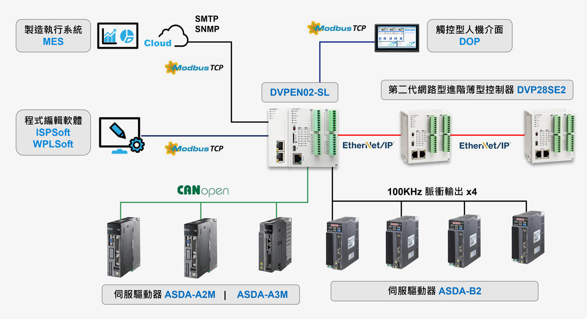 DVPEN02-SL為乙太網路通訊模組,可透過專案編輯軟體,進行遠端設定及通訊功能、e-mail 發送及安全的郵件協議 – SMTP TLS/SSL憑證、網路診斷。另外支援 Web page,便利更新韌體無需治具。