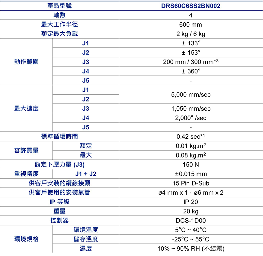 * 1 負載 1 kg 時,上下移動 25 mm,水平移動 300 mm,往返所需的時間,測試環境溫度 25 ºC,環境相對溼度 45% ~ 65% RH