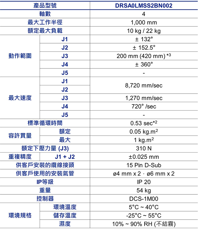 * 1 負載 1 kg 時,上下移動 25 mm,水平移動 300 mm,往返所需的時間,測試環境溫度 25 ºC,環境相對溼度 45% ~ 65% RH