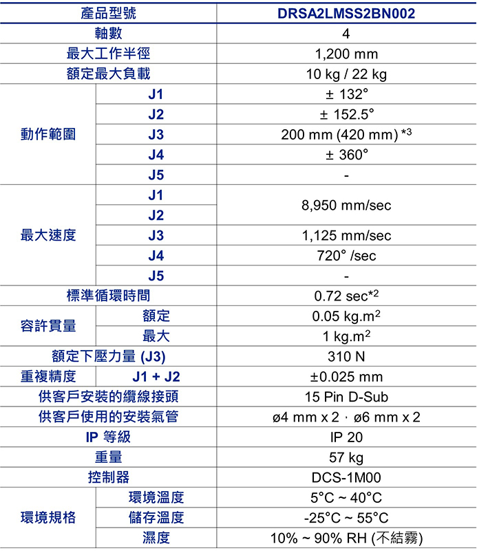 * 2 負載 2 kg 時,上下移動 25 mm,水平移動 300 mm,往返所需的時間,測試環境溫度 25 ºC,環境相對溼度 45% ~ 65% RH