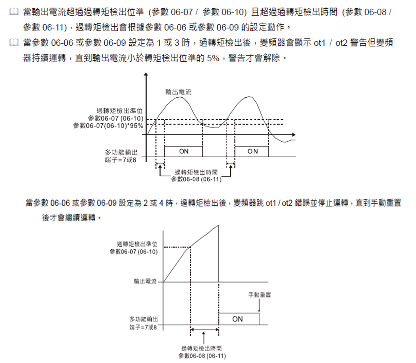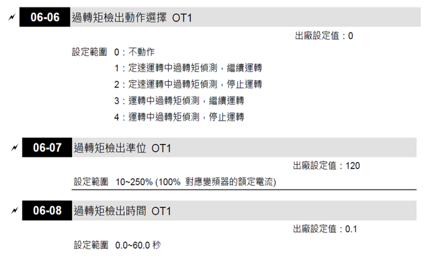 若使用大功率變頻器帶動小功率馬達,可能因各式原因導致電流過大而燒毀馬達,建議透過參數設定,讓使用者自行設定準位,即可在電流超標時,跳出警報或故障通知提醒,避免馬達過熱損壞。 可透過設定過轉矩參數達成上述目的,步驟如下圖: