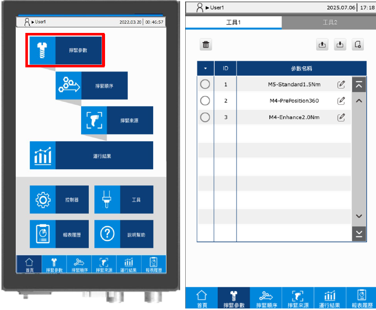 可以,DCSS 控制器支援多達 500 組螺絲類別 (擰緊參數),並可儲存 500 組配方(擰緊順序),操作員可透過觸控螢幕或外部指令,快速切換不同螺絲的鎖附參數 (例如:扭力、轉速、目標深度等),有效縮短設備調整與換線所需的停機時間。
