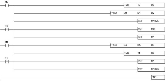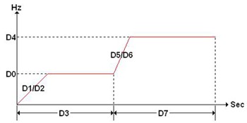 D0:第一段運行頻率 D1:第一段速的加速時間 D2:第一段速的減速時間 D3:第一段持續時間 D4:第二段運行頻率 D5:第二段速的加速時間 D6:第二段速的減速時間 D7:第二段持續時間 觸發M0後程序啟動,運行曲線如下圖: