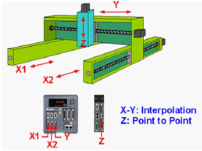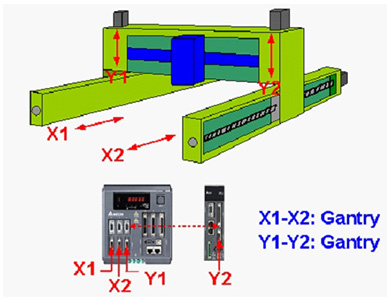 Y1與Y2為龍門控制,因Y1軸由ASDA-M控制,Y2軸由ASDA-A2控制,因此控制模式僅適用位置模式對位置模式(Pt模式或Pr模式)。