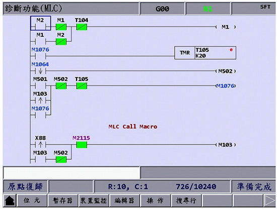 是的。除了使用PC軟體編輯MLC程式,再利用USB匯入控制器之外。使用者在控制器畫面可以監看MLC階梯圖與各個接點的狀態變化,也可以直接在線編輯存檔。方便程式的開發與維護除錯。