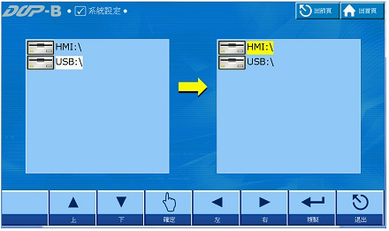 進入人機的系統畫面: 在編輯畫面做一個系統畫面的按鈕或是在人機的背面按下SYSTEM按鈕3秒即可. 進入系統畫面後選擇系統設定 -> 檔案管理 -> 複製檔案 需要把USB內的HMI-000複製到HMI的新檔案裡, 按下複製按鍵即可. 一切完成後重新上電新下載的程式便會開啟.