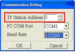 請檢查TPEditor軟體中的通訊站號是否與TP的站號相同。不確定TP的站號時,可將TPEditor的通訊站號設為0與TP通訊。(設0為廣播模式)