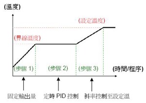 台達溫控器僅DTE系列(版本1.5以上)才具有「熱流道控制」功能。熱流道控制分為下圖3個步驟:1) 固定輸出量加熱;2) 定時PID控制(soak);3) 斜率加熱控制至設定溫度