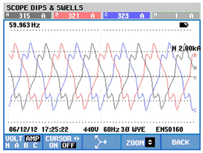 從圖表二得知,三相電流發生電流畸變情況。 圖表三
