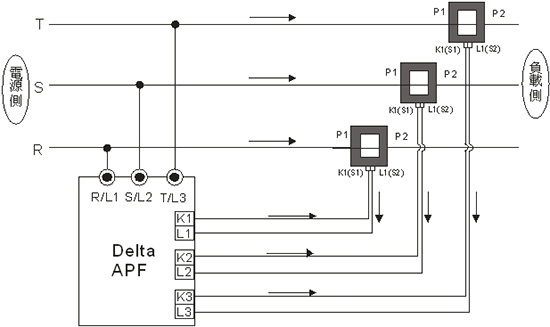 依現場環境的用電狀況不同,進行APF2000的規格容量計算,APF2000並聯多台,數量限制最多6台,其接線方式如下圖所示。