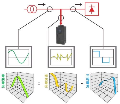 利用即時監控三相電與生成補償電流反饋技術的大功率電力電子裝置,並聯接入電網,透過電流互感器即時檢測三相電流波形,得到需要補償的諧波電流成分,再由主動式濾波器產生反向電流成分輸入供電系統,實現濾除諧波的功能。